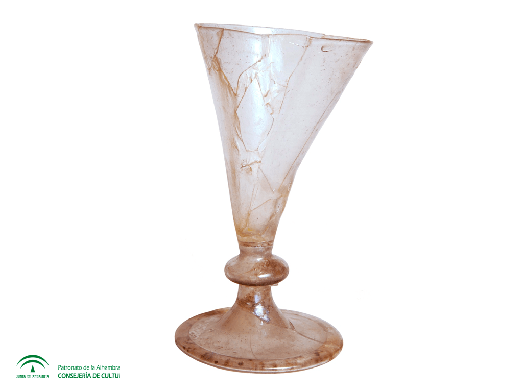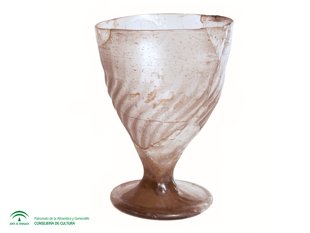 Haz circular la copa de cristal, pues la brisa se hace sentir al-Mu?tamid A diferencia de otros materiales, como la cerámica, son escasas las piezas de vidrio hispanomusulmán que han llegado hasta nosotros y la mayoría de las que se conservan corresponden a pequeños fragmentos. Más allá de la fragilidad del material, los objetos del ajuar doméstico realizados en vidrio fueron ya de por si escasos pues la vajilla de este tipo  tuvo un uso limitado a ambientes suntuarios, como el de la Alhambra. Su escasez hace que las piezas destacadas que os mostramos hoy, y que se pueden ver en la sala VII del museo, sean aún más significativas. Se trata de tres copas de vidrio, incoloras y transparentes, realizadas en época nazarí  mediante la técnica de soplado y provenientes de la propia Alhambra. Se utilizaron para el consumo de líquidos en el servicio de mesa. Copa 1602 Recipiente realizado en dos piezas, la superior con cuerpo cónico invertido, ancho y corto con borde muy fino y redondeado; y la inferior formada por un pie de un solo piso. La unión de depósito y pie se hace directamente, sin pata. La copa está ornamentada con costillas o nervios helicoidales que cubren 2/3 del depósito. Esta decoración continúa en el pie, que además presenta un contorno levemente lobulado. alh.069 Copa 1608 Se forma a partir de dos piezas: una superior o cuerpo cónico alargado que tiende al cilindro con borde muy fino y redondeado, y otra inferior formada por un pie de dos pisos con forma acampanada. La unión de depósito y pie se hace directamente, sin pata. La parte inferior del depósito tiene, a modo de ornamentación,  costillas o nervios que alcanzan los 4cm de altura, en el centro presenta motivos en relieve con forma de V unidos a modo de cadena. alh.070 Copa 1609 Copa hecha en dos piezas. La de arriba tiene un cuerpo cónico alargado y muy estrecho con borde muy fino y redondeado, la de abajo está formada por un pie, también cónico de un solo piso. La unión de depósito y pie se hace por medio de un nudo macizo. La superfieie es lisa y sin decoración. alh.071