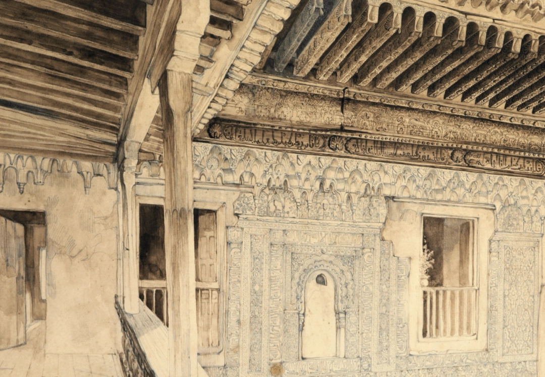 Detalle dibujo Granada, Alhambra, Patio de la Mezquita o Casa del Gobernador, Harriet Ford (1808-1837), lápiz y aguada sobre papel, cortesía de Francis Ford.