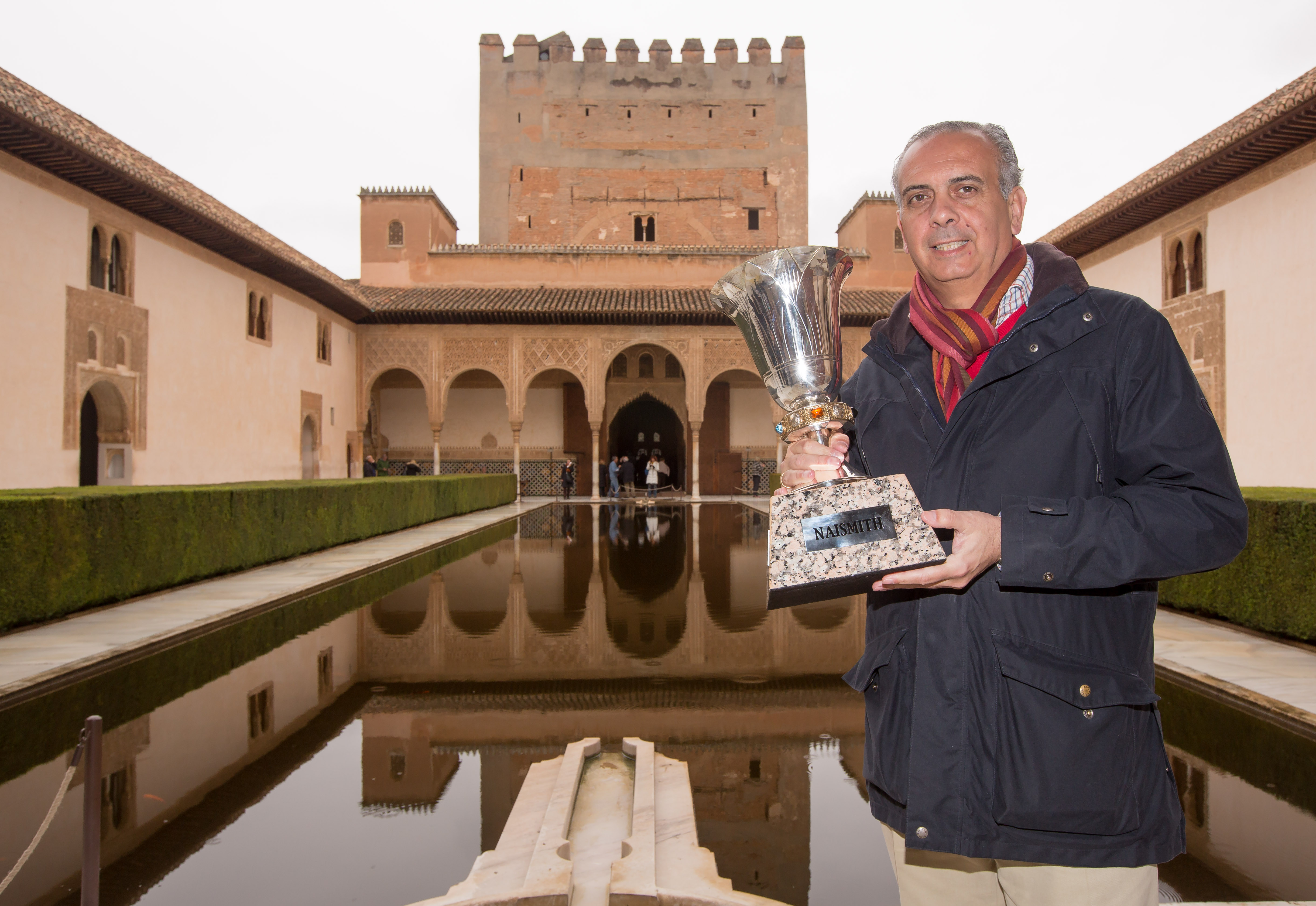 El presidente de la Federación Española de Baloncesto (FEB), José Luis Sáez, ha buscado un hueco en su apretada agenda para visitar, en esta lluviosa mañana invernal, la Alhambra. En su recorrido por los Palacios Nazaríes, Sáez ha estado acompañado por el responsable de eventos de la FEB, Paco Barranco, y ha querido fotografiarse con la Copa del Mundo del Mundial de Japón de 2006 en el Patio de Arrayanes.