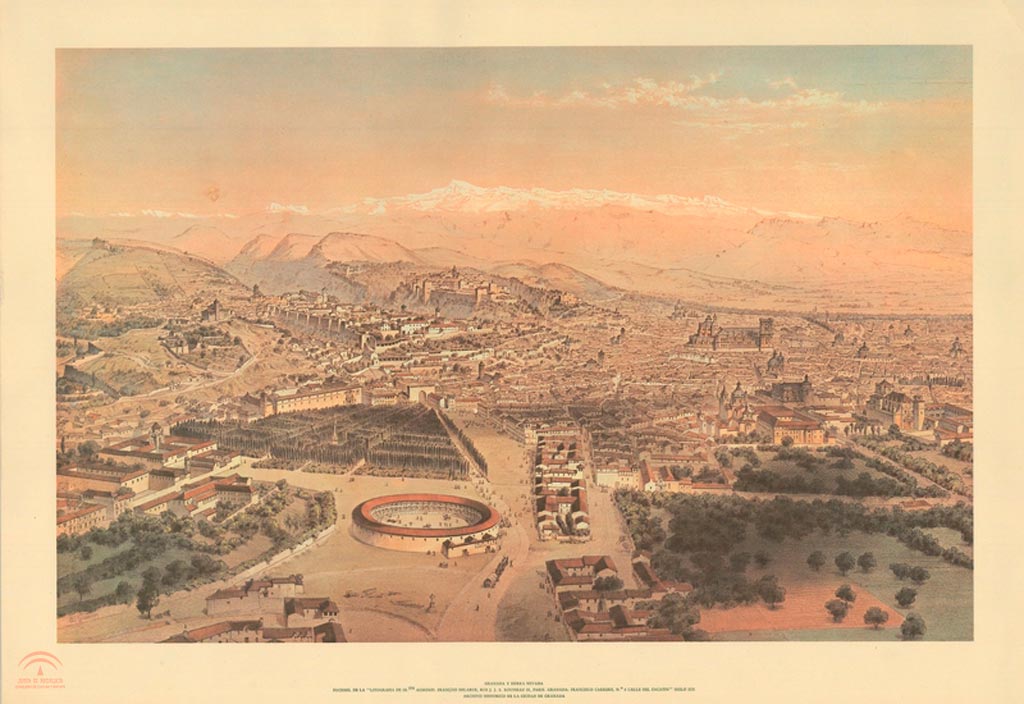 | Resumen: | Vista de la ciudad de Granada y la Alhambra con Sierra Nevada al fondo. En primer término la antigua plaza de toros del Triunfo y los jardines o alameda que existía delante de la Puerta Elvira. |
