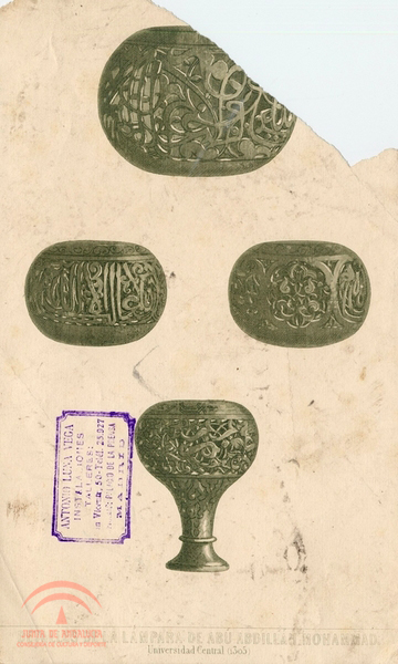 R. Falta un pedazo en su margen superior derecho y esta manchado. Grabado calcográfico de 257 x 152 mm. en cartulina. En el tomo II del Museo Español de Antigüedades (1873) hay un artículo de Rodrigo Amador de los Ríos en que informa que dicha lámpara estuvo expuesta en la Biblioteca de la Universidad Central de 1848 a 1868, año en que pasó al Museo Arqueológico Nacional. Signatura antigua: 791.-
