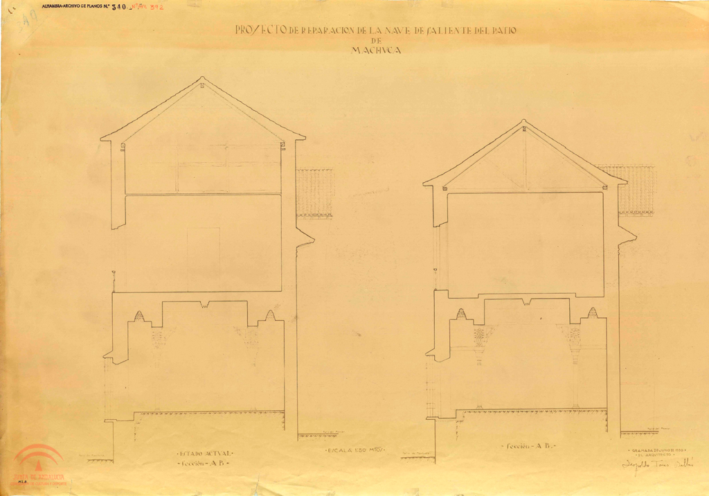 Patio de Machuca. Proyecto de reparación Nave de saliente (Mexuar). Sección por A-B. Estado actual y proyecto