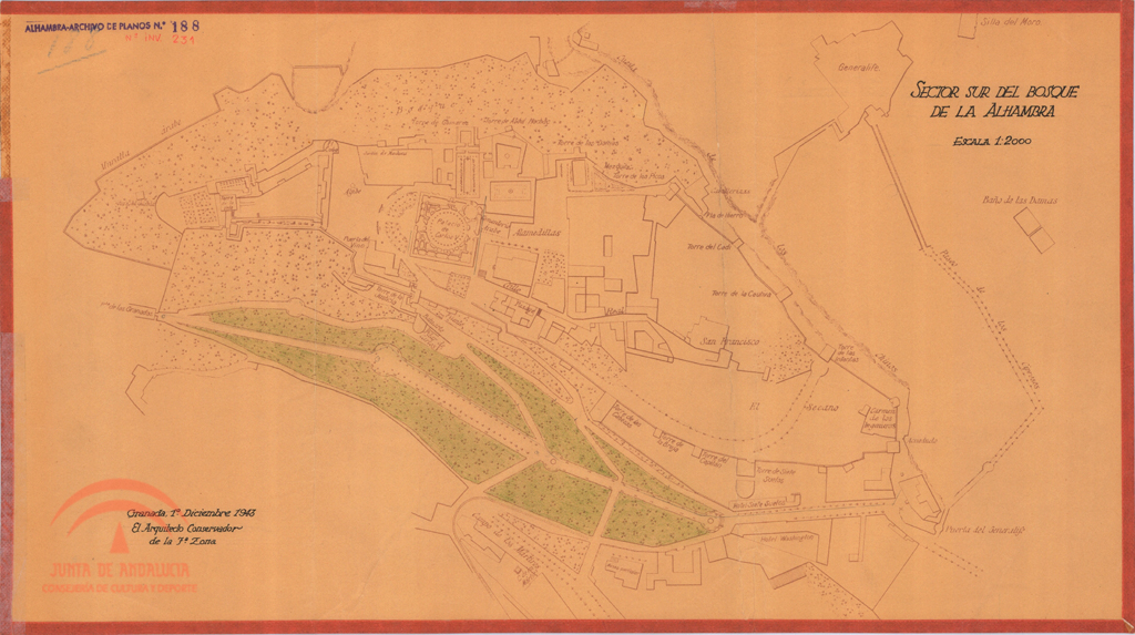 sectores: 24, 26, 1, 2, 3, 4, 5, 6, 7, 8, 9, 10, 11, 12, 22, 27, 29 Numero de plano de la oficina técnica del servicio de conservación: 188, (Alhambra-archivo de planos Nº 188)
