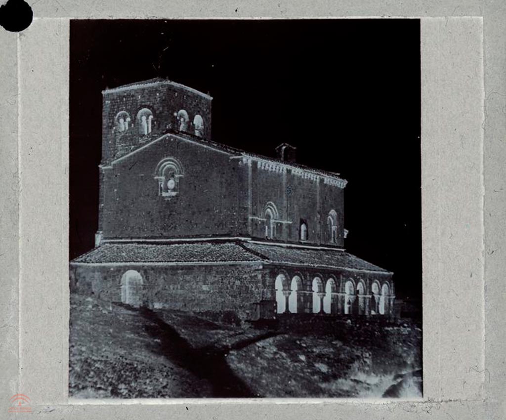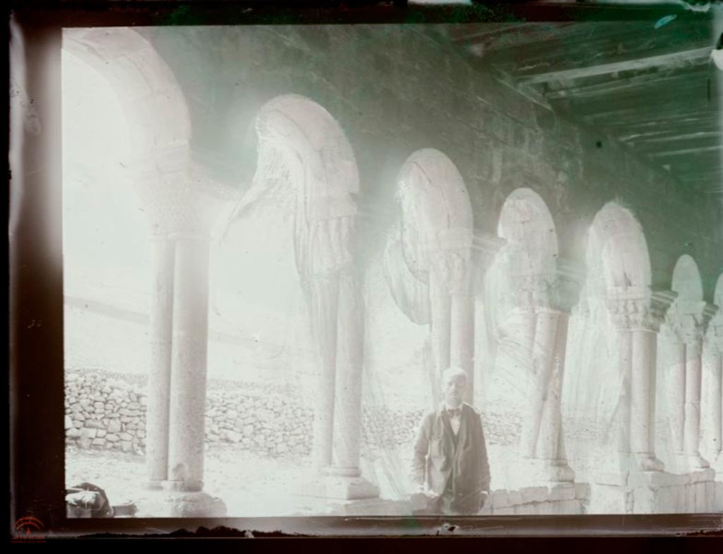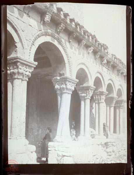 Vista des del exterior de la galería porticada situada en el lado sur de la iglesia. Los arcos estan tapiados, no actualmente. Dos mujeres salen de la puerta.