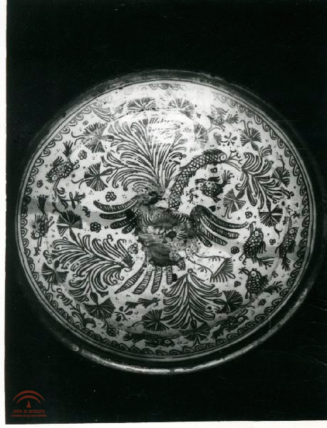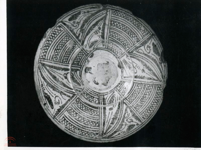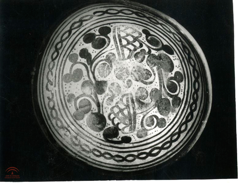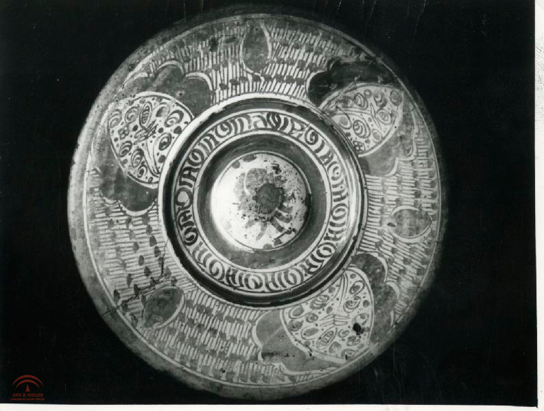 Argolla o tirador de hierro cincelado, sobre fondo de tela, con se solían guarnecer los portones exteriores de las casas musulmanas, adquisición del Museo alrededor de los años 70, según consta en articulo publicado por su director Jesús Bermúdez Pareja |