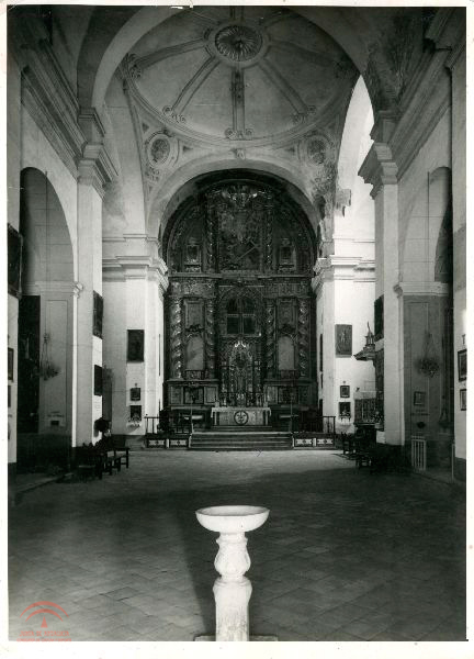 Interior de la Iglesia de Santa María de la Alhambra, crucero, y retablo del altar mayor. En el retablo aún no está Santa María de la Alhambra, ni el Cristo Crucificado, ni las Santas entre columnas. Las columnas salomónicas tienen los racimos. Pila en el centro de la fotografía. En el arranque de los arcos, está el ladrillo a la vista |