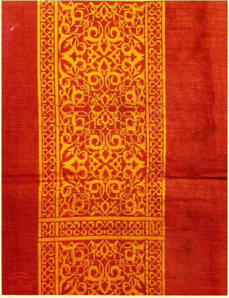 Fragmento textil de una cortina de periodo nazarí del siglo XV que se ofreció al Museo de la Alhambra. Tiene dos colores, dorado y rojo, los motivos son vegetales y cenefas con motivos geométricos, a modo de greca