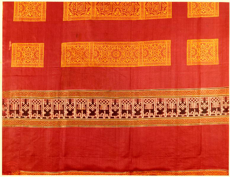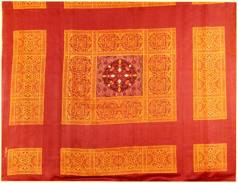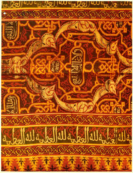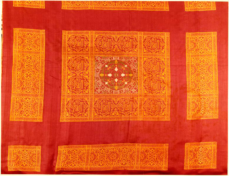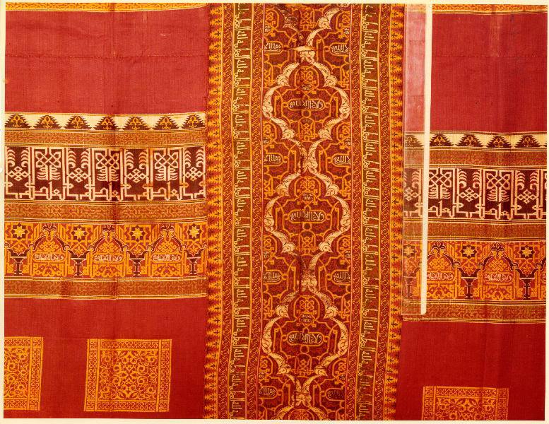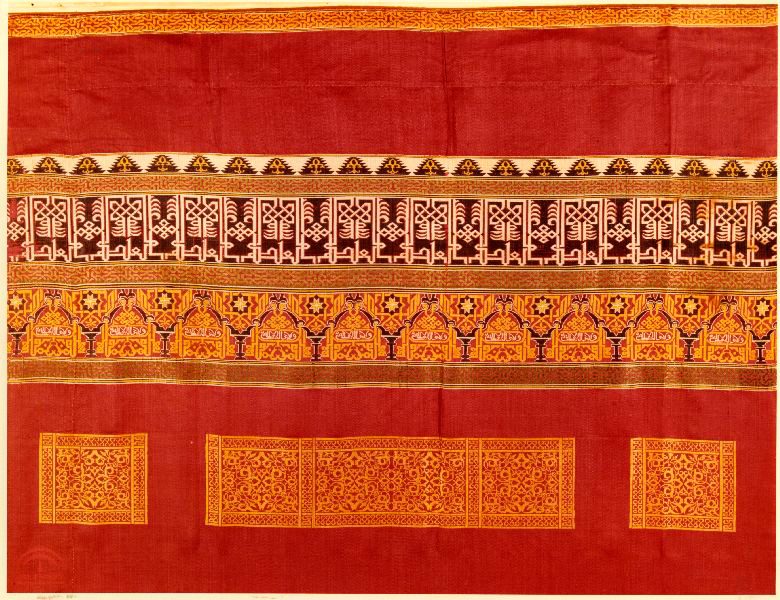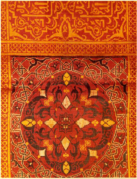 Fragmento textil de una cortina de periodo nazarí del siglo XV que se ofreció al Museo de la Alhambra. Tiene tres colores, dorado negro y rojo los motivos son figurativos y de caracteres cúficos, así como vegetales y cenefas