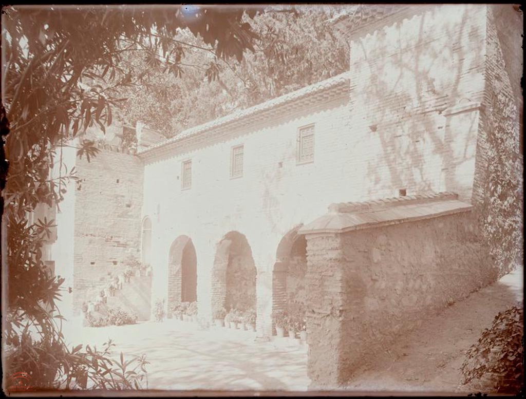 Aspecto que mostraba el pabellón tras las obras de intervención de Torres Balbás. En ellla, abre los arcos y puerta, dotando a esta última de una escalera.