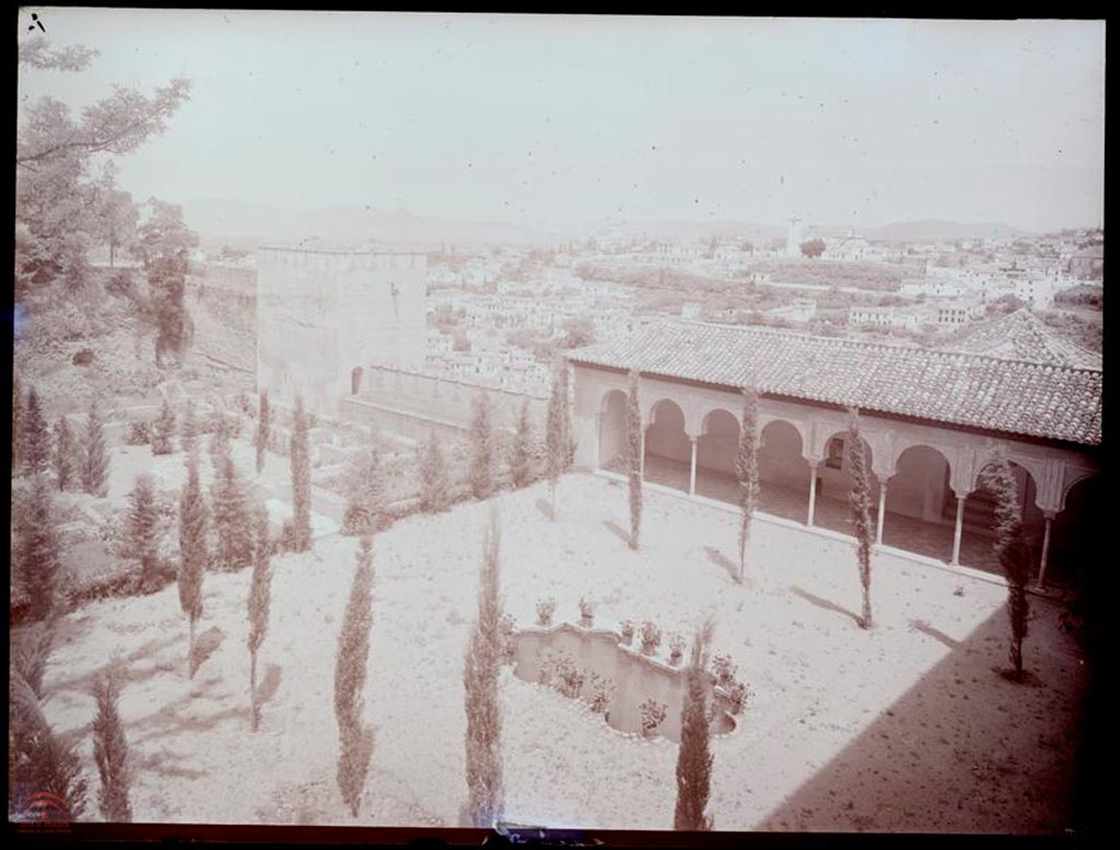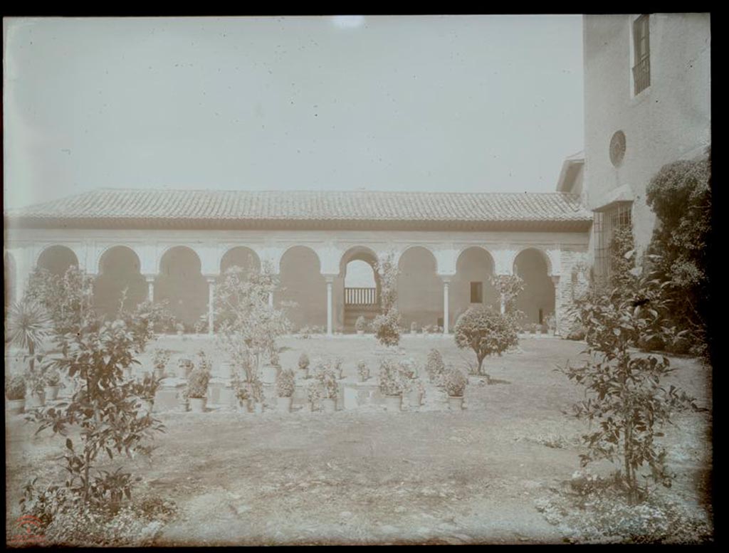 "Aspecto que presenta esta zona - Patio de Machuca, su galería de arcos, y Madraza de los Príncipes - tras las obras de restauración de Torres Balbás, la vegetación ha sido cambiada y ""reducida"" dejando apreciar más el aspecto de conjunto de este espacio"