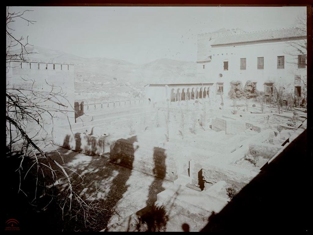 Vista de la galería del Patio de Machuca apuntalada, con vista de la alberca, probablemente durante la restauración de Torres Balbás. Arxiv Mas Barcelona