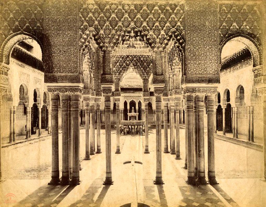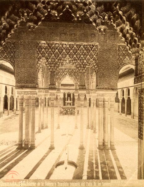 Interior de la Galeria y Templete poniente del Patio de los Leones, la fuente central tiene el añadido superior del "restaurador adornista" Rafael Contreras
