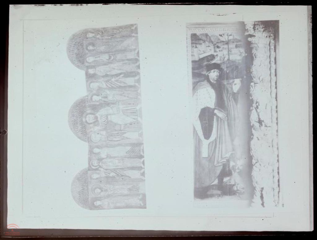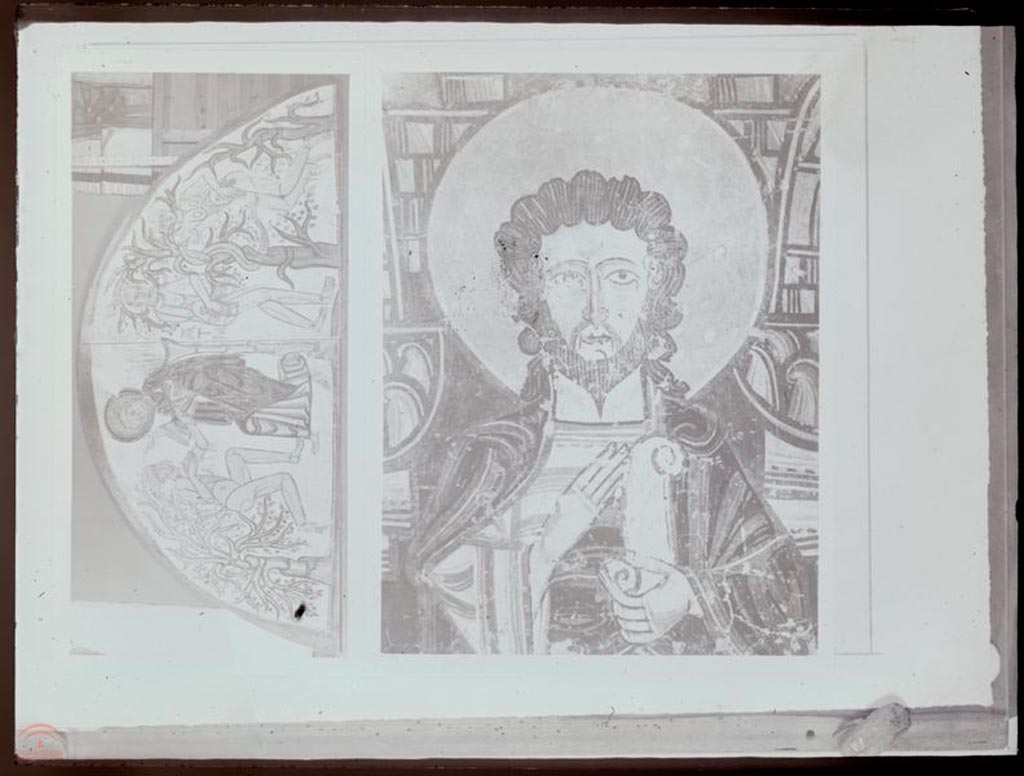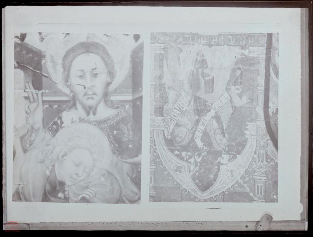Aparecen dos fotografías- láminas, probablemente pertenecientes a un libro .Cada una ocupa una mitad del soporte. La p m de la Ermita , esta junto a una ventana. Parece ser un Cristo vendiciendo. Presenta numerosas lagunas de pintura. Valca Universal (Ortocromática Antihalo)