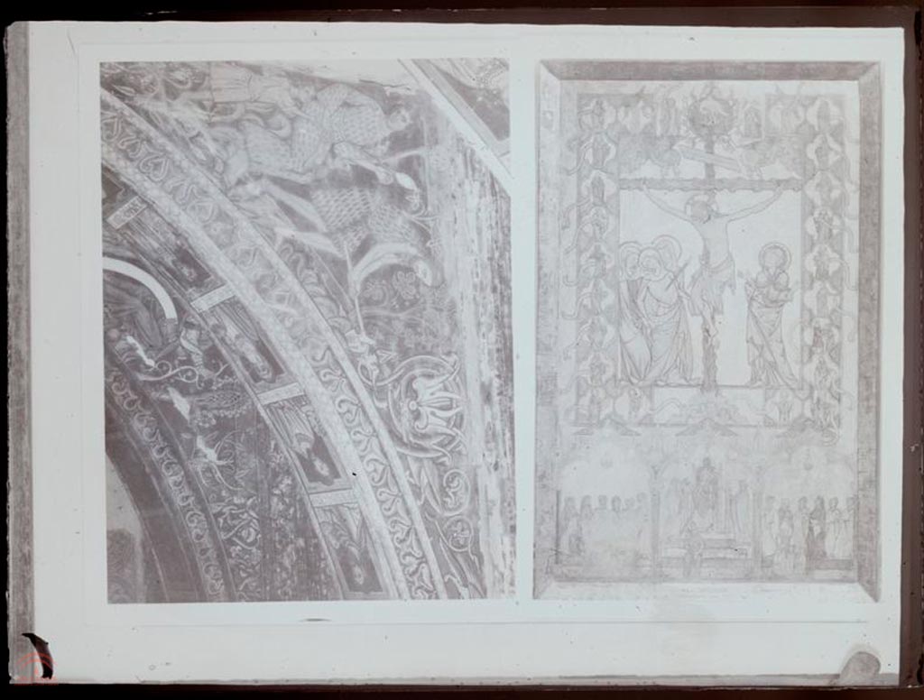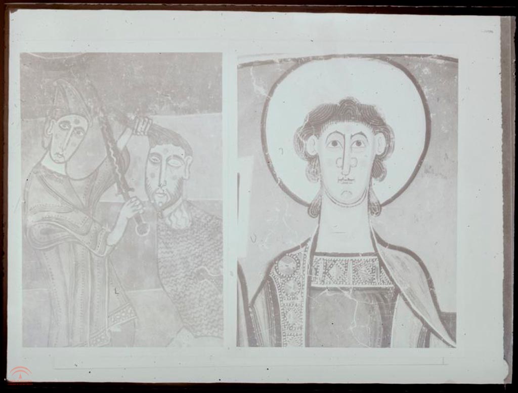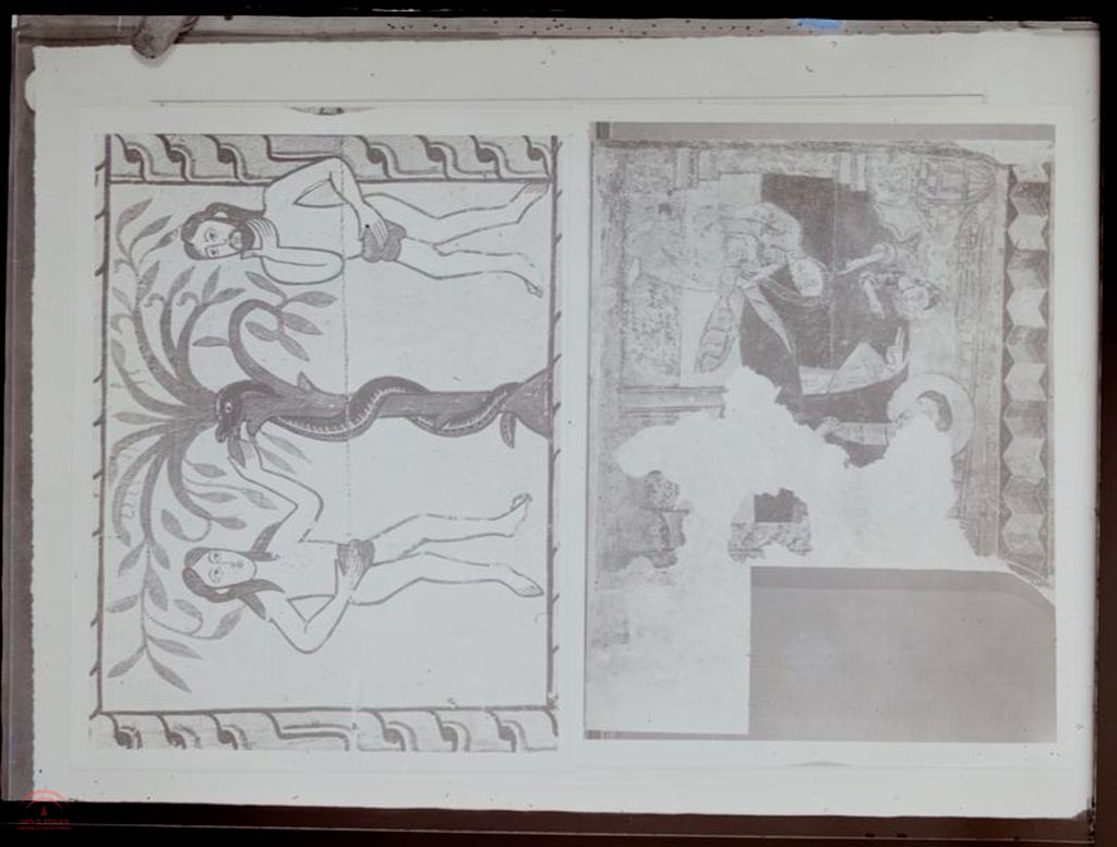 Aparecen dos fotografías- láminas, probablemente pertenecientes a un libro .Cada una ocupa una mitad del soporte. Las pinturas de sigena aparecen en una albanega de un arco , y en su intrados. Valca Universal (Ortocromática Antihalo)