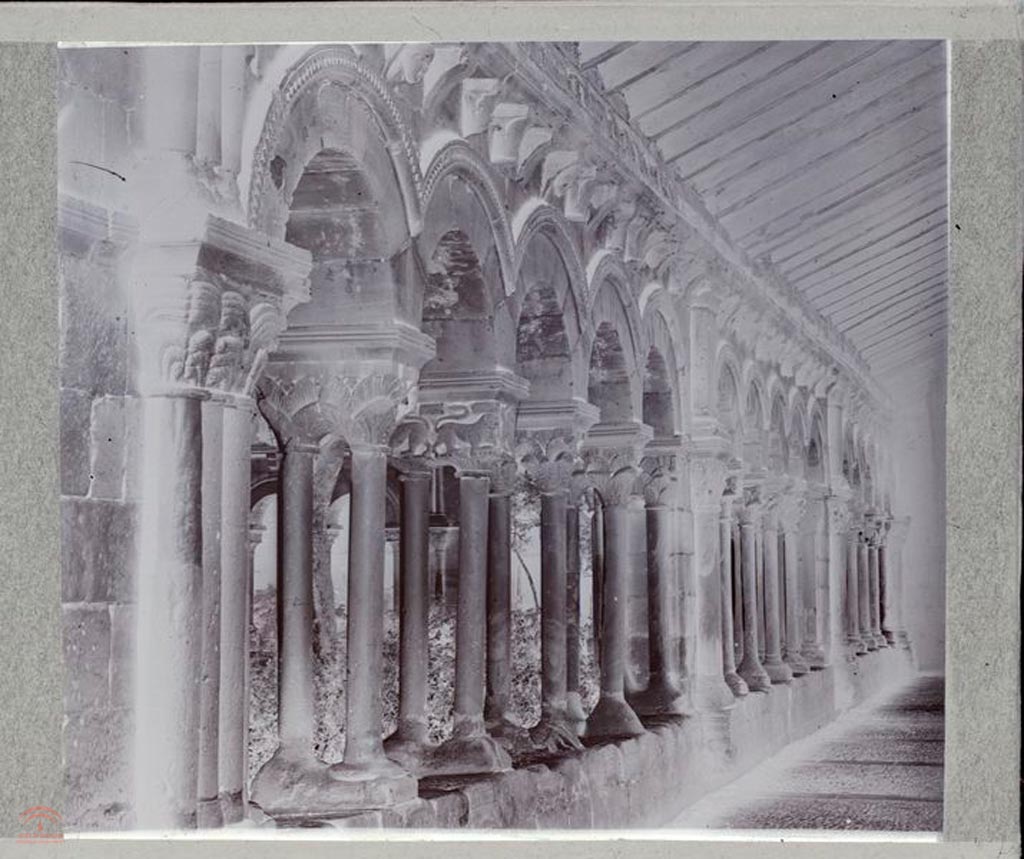 Se observan los dos pisos de galerias con columnas des de el interior de dos arcos de la planta inferior. En primer plano vemos perfectamente dos capiteles.