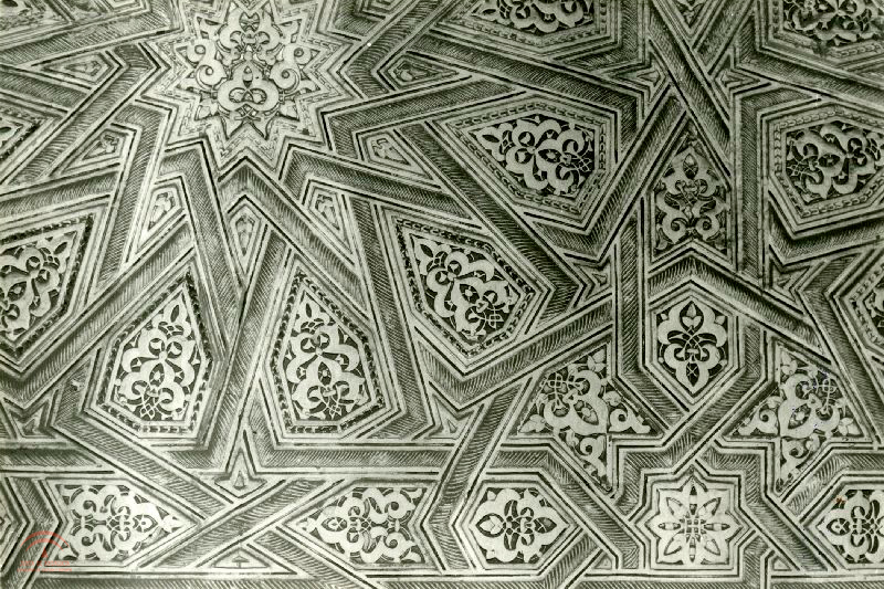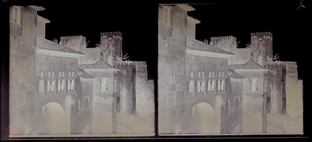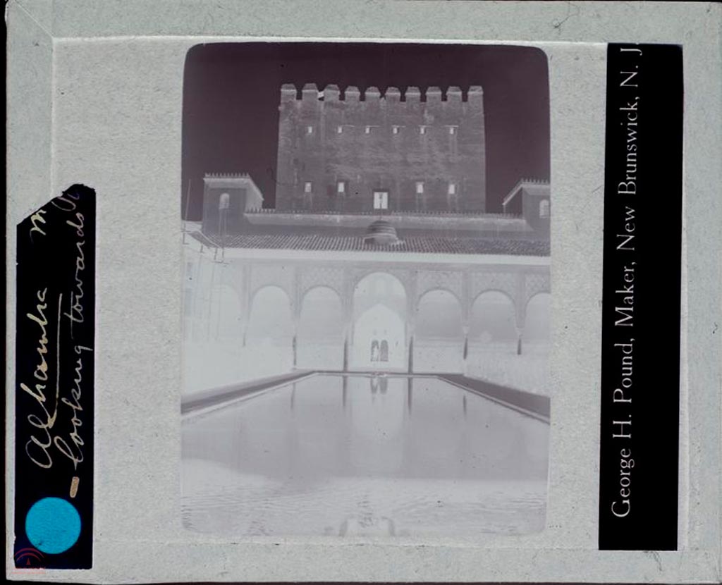 Exterior de la Torre de Comares, siendo su fachada occidental ¿desde el posteriormente desmontado balcón de Machuca?. La imagen es anterior a la intervención de Torres Balbás. Se observa el estado de la Torre y las ventanas, algunas tapiadas.
