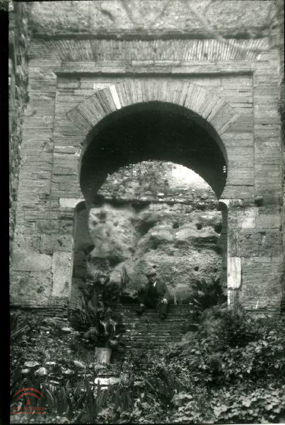 Puerta de Monaita de Granada, del siglo XI, con arcos de herradura de piedra franca y encima dintel de ladrillo. En la escalinata, está sentado un hombre con gorra, chaqueta y chaleco