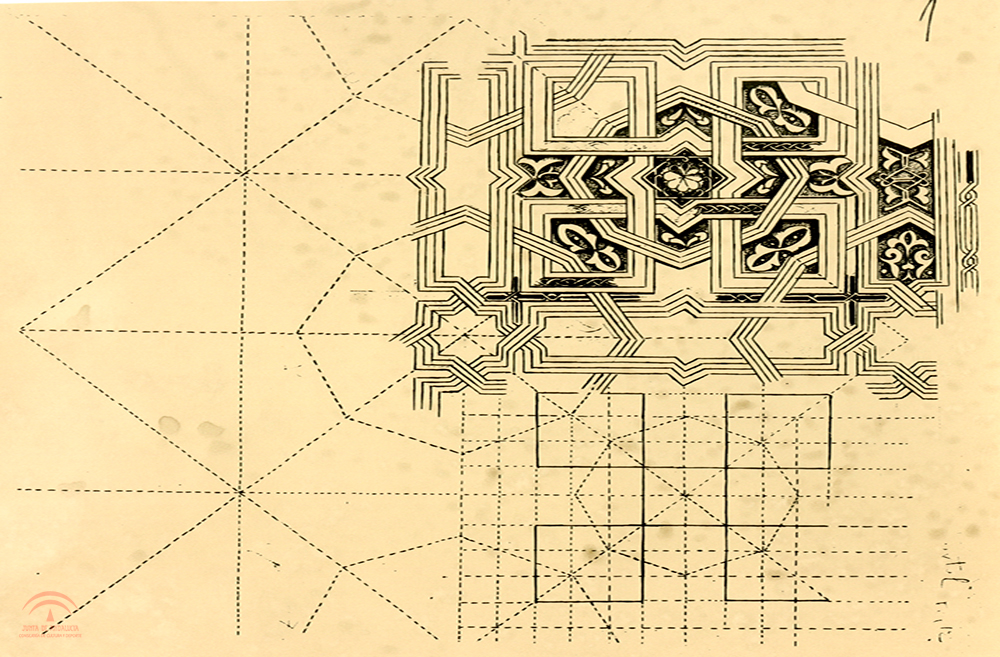 | Resumen: | Bordeado de cenefas estrechas ocupadas por inscripciones cursivas, el friso superior se compone de maderas separadas por calles estrechas adornadas con estrellas de 8 puntas, estas se repityen alternando con octogonos de dos tamaños en las cuadros. Dibujo de la tramado de una techumbre de madera, de estilo nazarí, el dibujo pertenece a la colección del Archivo del Patronato de la Alhambra |