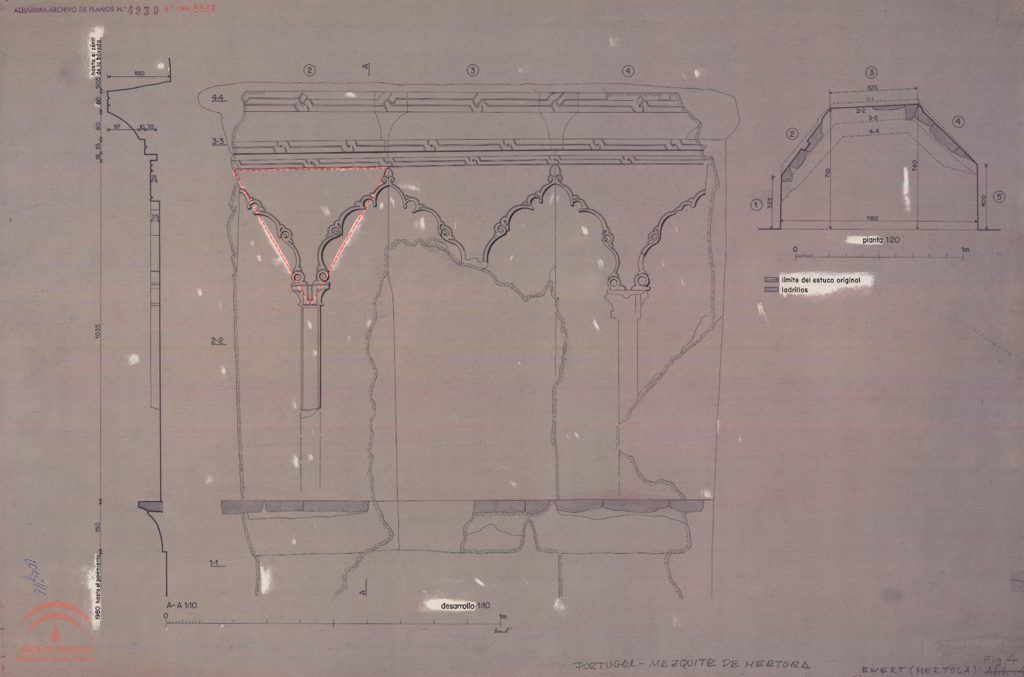 Descripción: Copia con adiciones, Papel poliéster, Copiativo con adiciones a tinta negra y roja, 41 x 62 cm., Varias, 99Christian Ewert:"La mezquita de Mértola (Portugal)", en "Cuadernos de la Alhambra", 9, 1973Numero de plano de la oficina técnica del servicio de conservación: 4239, Con cotas