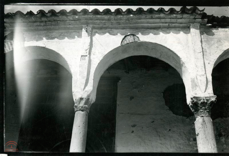 Resumen: Patio encalado con dos arcos, columnas y capiteles romanos reutilizados