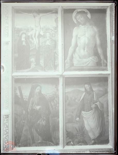 | Resumen: | Vista parcial de un retablo de pintura flamenca de la Capilla Real de Granada. Presenta 4 escenas: Calvario, Resucitado y 2 santos (San Andres). El Cristo muerto ante el sepulcro ha sido clasificado por el profesor Berenson como obra del Perugino. |