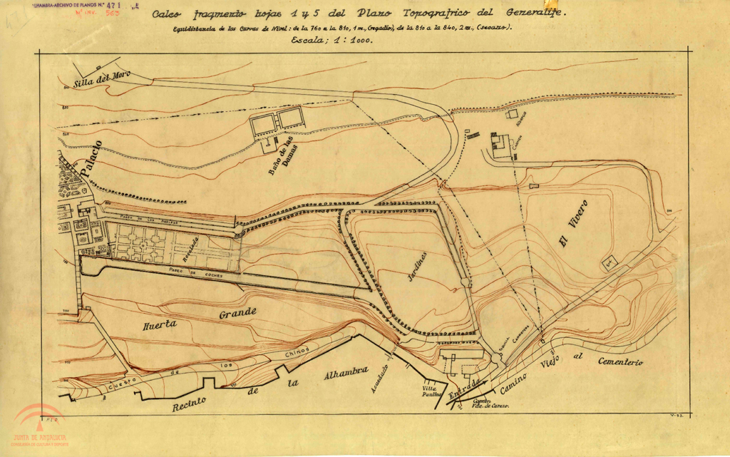 sectores: 11, 12, 13 14, 15, 16, 17, 18, 19, 20, 32 Numero de plano de la oficina técnica del servicio de conservación: 471, (Alhambra-archivo de planos Nº 471) Digitalizado Calco. |