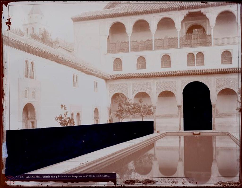 | Resumen: | Vista lateral del Patio de los Arrayanes de la Alhambra con la galería sur. Con numeraciones 13, 231 y 56 |