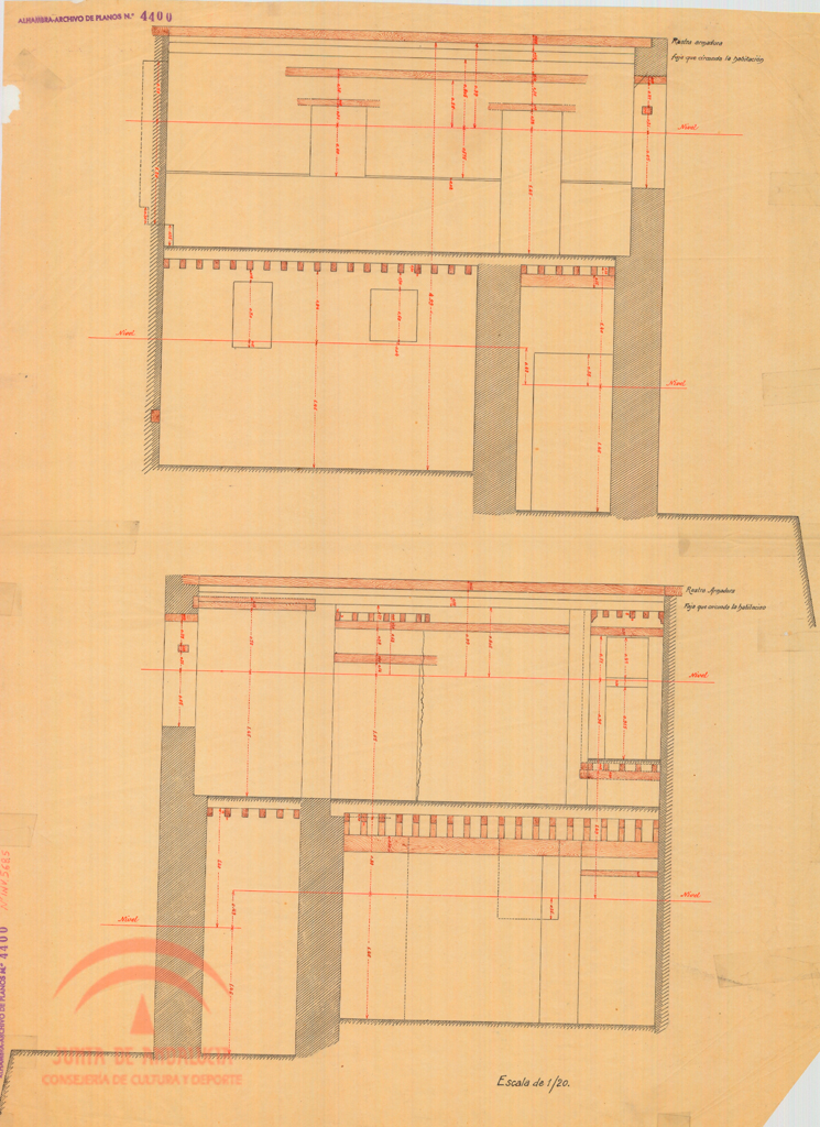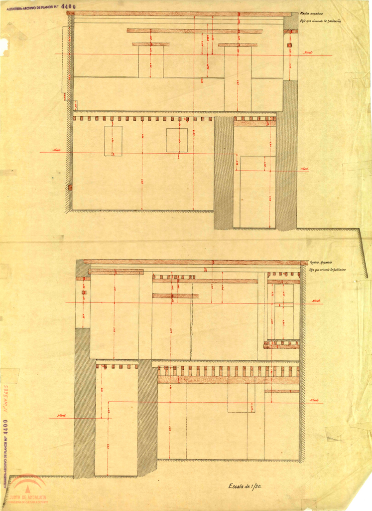 Descripción: Pequeños rasgados, doblezOriginal, Papel transparente, Tintas de color, 66 x 49 cm., 1/20, 99Numero de plano de la oficina técnica del servicio de conservación: 4400, Con cotas. Digitalizado