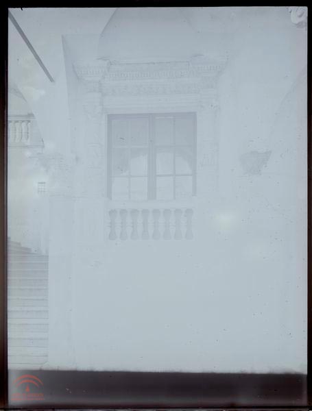 Resumen: Vano junto al arranque de la escalera del patio enmarcado entre columnas con balaustrada inferior entre los plintos.