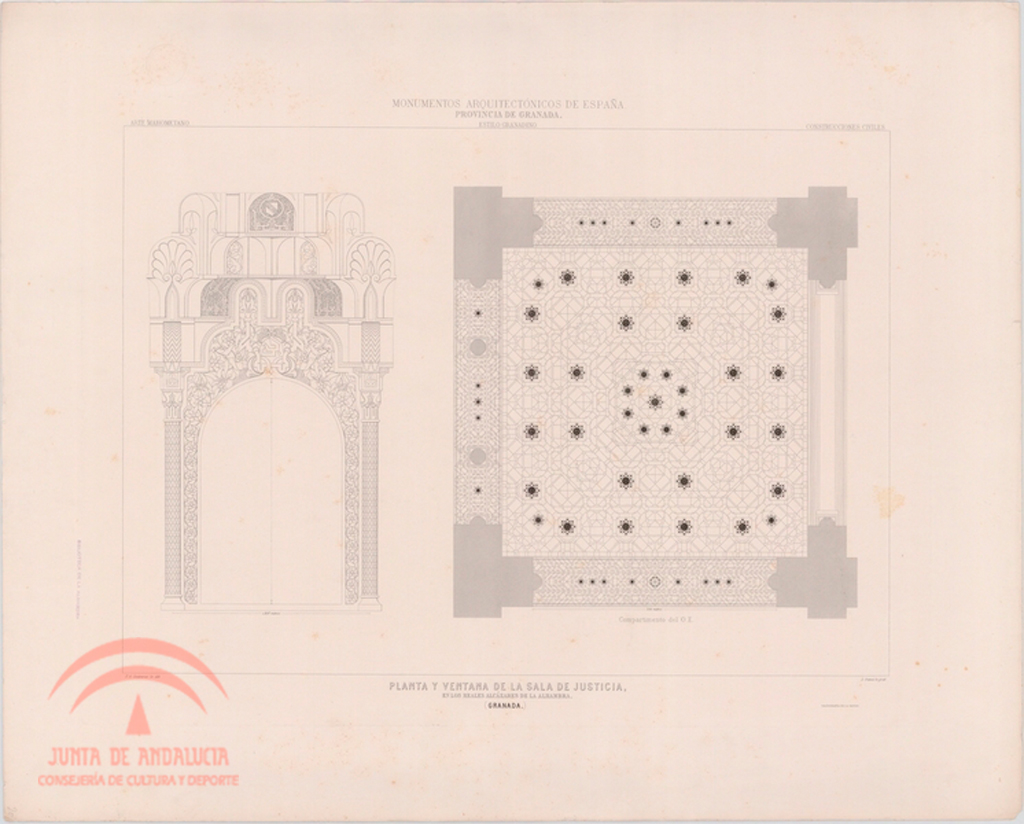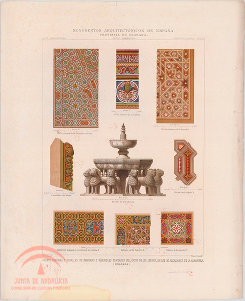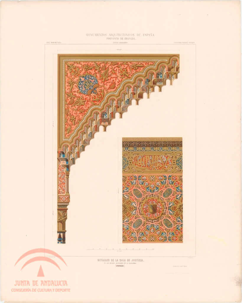 | Resumen: | Palacio Árabe de la Alhambra. Detalles de la Sala de la Justicia. F. A. Contreras dib[ujó]., Teo. Rufflé lit[ografi]º. Cromolitografía de D. Castell, Madrid. Del libro "Monumentos Arquitectónicos de España. Provincia de Granada. Palacio Árabe de la Alhambra", Madrid, Imprenta y Calcografía Nacional (1859-1881) |