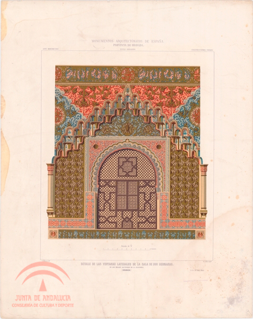 | Resumen: | Palacio Árabe de la Alhambra. Detalles de las ventanas laterales de la Sala de Dos Hermanas. F. A. Contreras dib[ujó]., Teo. Rufflé lit[ografi]º. Cromolitografía de D. Castell, Madrid. Del libro "Monumentos Arquitectónicos de España. Provincia de Granada. Palacio Árabe de la Alhambra", Madrid, Imprenta y Calcografía Nacional (1859-1881) |