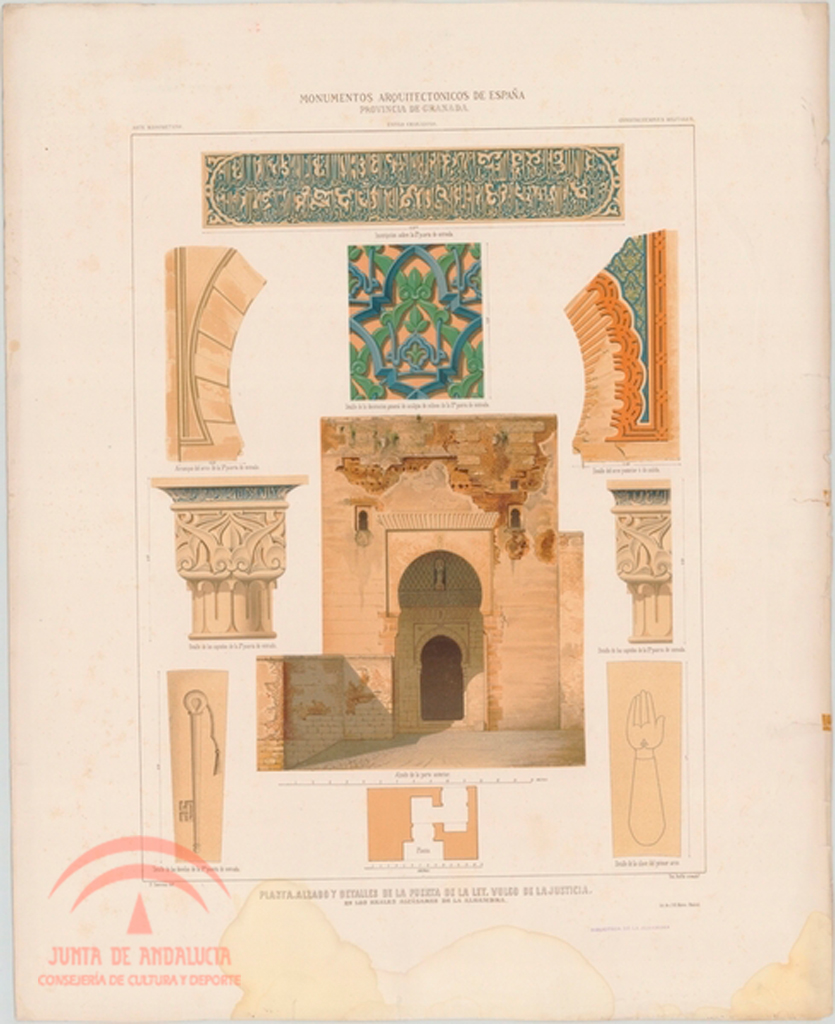 | Resumen: | Palacio Árabe de la Alhambra. Planta, alzado y detalles de la Puerta de la Ley, vulgo de la Justicia. F. Contreras dib[ujó]., Teo. Rufflé cromolit[ografi]º, Lit[ografía]. de J. M. Mateu, Madrid. Del libro "Monumentos Arquitectónicos de España. Provincia de Granada. Palacio Árabe de la Alhambra", Madrid, Imprenta y Calcografía Nacional (1859-1881) |