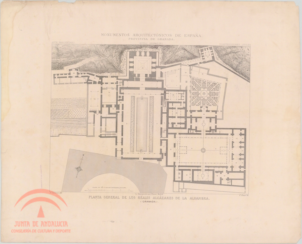 | Resumen: | Palacio Árabe de la Alhambra. Planta general de los Reales Alcázares de la Alhambra. F. Contreras dib[ujó]., F. Kraus lit[ografi]º, Estampación J. Donon, Madrid. Del libro "Monumentos Arquitectónicos de España. Provincia de Granada. Palacio Árabe de la Alhambra", Madrid, Imprenta y Calcografía Nacional (1859-1881) |