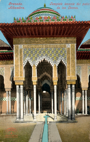 En la imagen se observa en primer lugar la Fuente del Patio de los Leones, en la que se observa ya la construcción del segundo piso de la fuente. Y al el Templete levante del patio de los Leones, con sus arcos de medio punto y mocárabes, que da acceso a la Sala de los Reyes. Se pueden observar los arcos que se apoyan sobre columnas, tanto sobre una como en grupos de dos columnas. En la parte superior se ve la cúpula característica del templete pintada de colores: azul, verde, blanco y rojo. La disposición de la foto es horizontal |