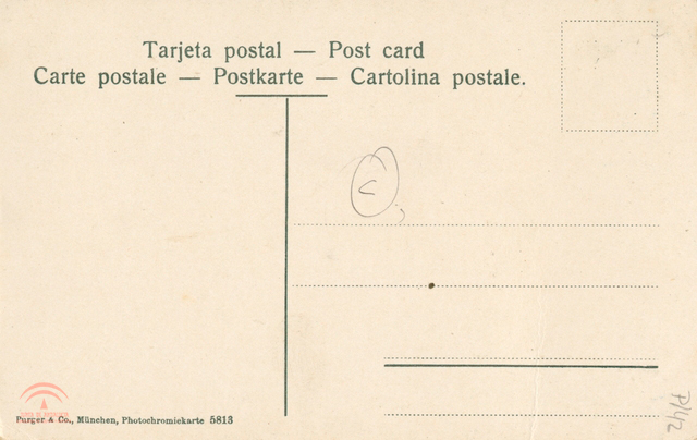 B tarjeta postal coloreada de 89x140mm. Colores: gris, marrón, azul, verde rojo, blanco. Texto en el anverso: " Hotel Washington Irving. 26 April. Having lonley... .enjoying everything. This is the first beautiful ........ Hotel de Madrid, Sevilla May 3rd...Malaga Monday...."