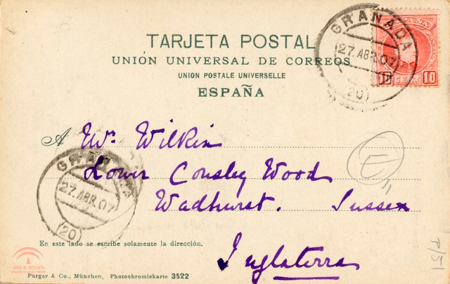 Enviada a: " W. Wilrin. Louis Cousley Wood. Wadhuret. Vussex. Inglaterra."