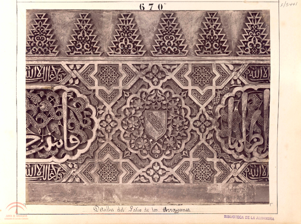 | Descripción: | pegada sobre soporte secundario, sello de la biblioteca, en la parte superior escrito "644" 490x350 mm, copia a la albumina en b/n 1.1.1. Compuesta por dos fotografias en la misma cara del soporte, esta acompañada por la F-05414 1.1.2. Titulo manuscrito en el soporte 1.3.1. Tambien denominado Patio de los Arrayanes, de Comares, de la Alberca, de los Mirtos o del Estanque 1.4.4. En el sello se lee "Biblioteca de la Alhambra" |
