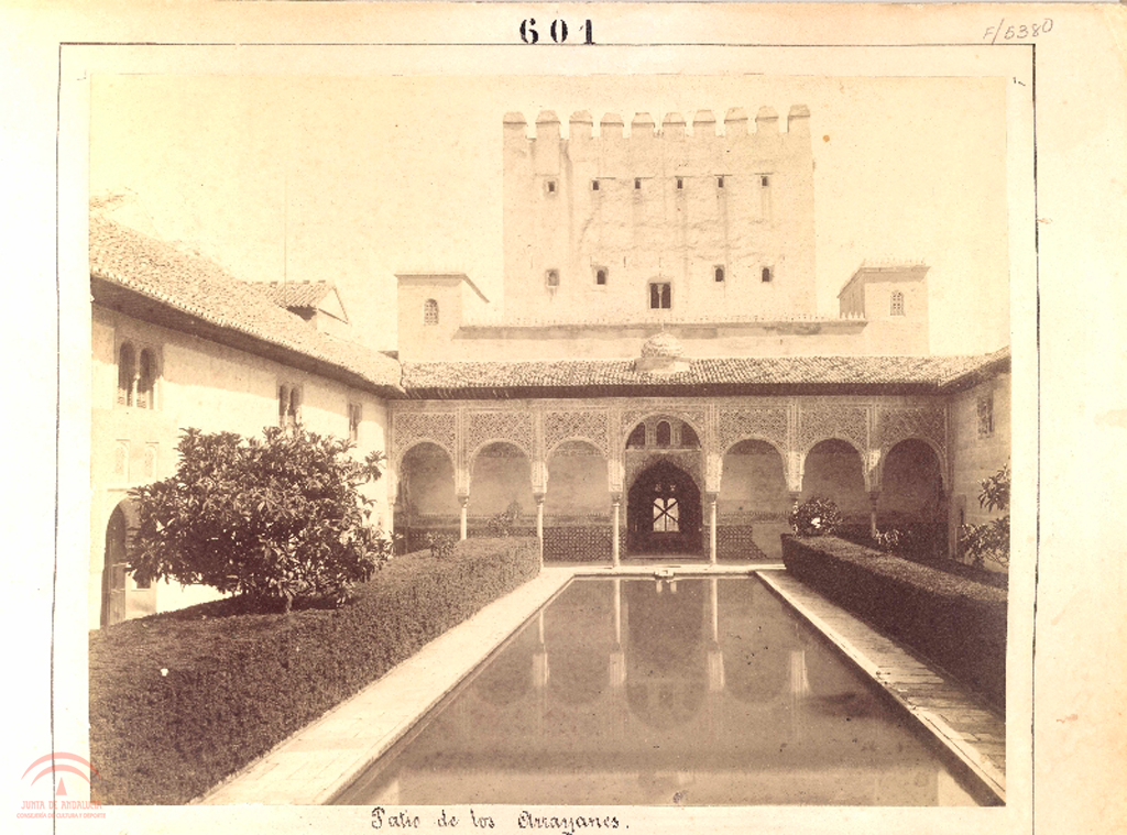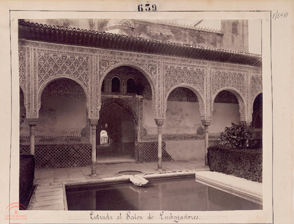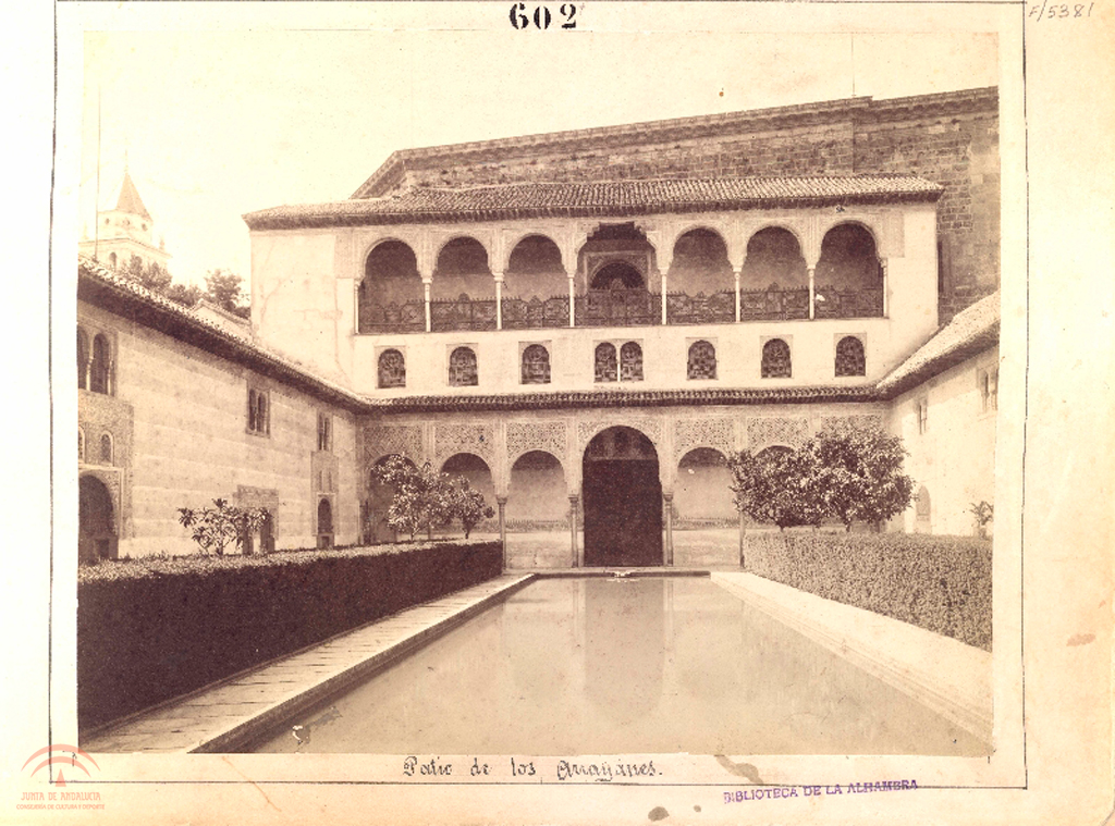| Descripción: | pegada sobre soporte secundario, titulo en el soporte secundario, marca del fotografo en la parte inferior izquierda, sello de la biblioteca y estampación en frio del fotografo 600x440 mm, copia a la albumina virada a sepia 1.5.1. En el portada se lee "Recuerdos fotograficos de la visita de SS. MM. y AA. RR. a las provincias de Andalucia y Murcia en Septiembre y Octubre de 1862. Por C. Clifford, fotógrafo de S. M." Tambien hay un sello donde se lee "Donativo del Sr. Conde de Romanones a la Biblioteca de la Alhambra. 1909" 1.4.4. En la estampacion en frio se lee "[escudo fotografo]. C. Clifford. Photo of H. M.". En el sello se lee "Biblioteca de la Alhambra" 1.3.1. Tambien denominada Patio de los Arrayanes, de Comares, de la Alberca, de los Mirtos o del Estanque |