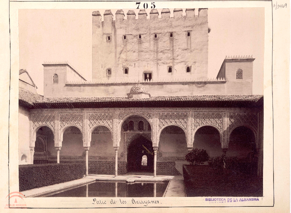 | Resumen: | Vista, desde la entrada meridional, de la fachada Norte del Patio de Arrayanes |