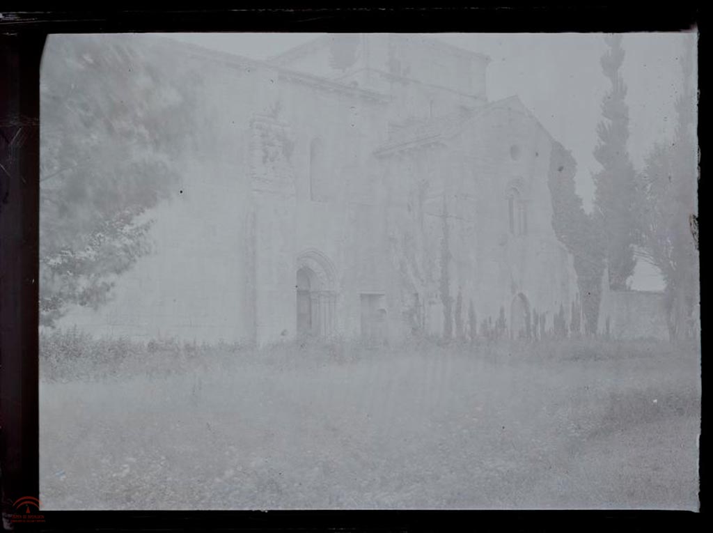 Resumen: Vista lateral de una iglesia románica. Destacan los gruesos contrafuertes que refuerzan el muro y las esquinas. Aparecen dos vanos de acceso ligeramente apuntados.