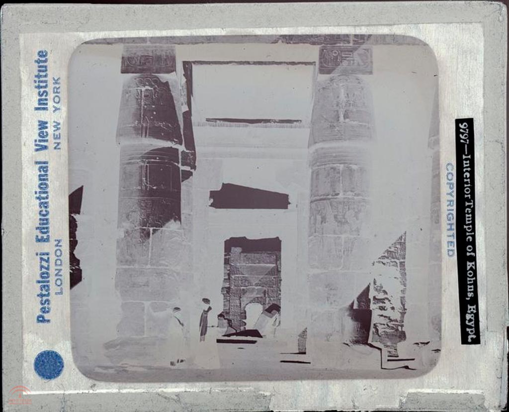 | Resumen: | Vista parcial del interior del templo de Kohns con sus monumentales columnas palmeriformes decoradas, y dos hombres. |