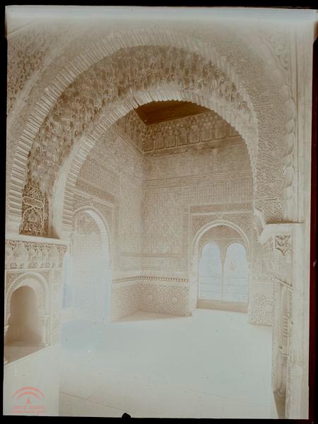 | Resumen: | En primer plano aparece el intrados y la jamba de un arco polilobulado con mocarabes, que da paso a una sala , toda llena de yeserias. Se ve una de las esquinas con una ventana y una puerta a cada lado. |