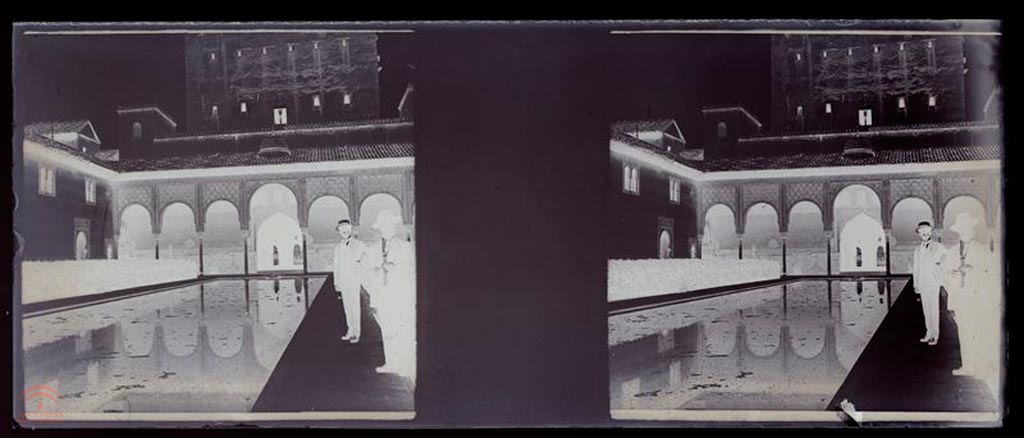 Resumen: Estanque del Patio de los Arrayanes con la Torre de Comares al fondo y dos hombres junto al estanque
