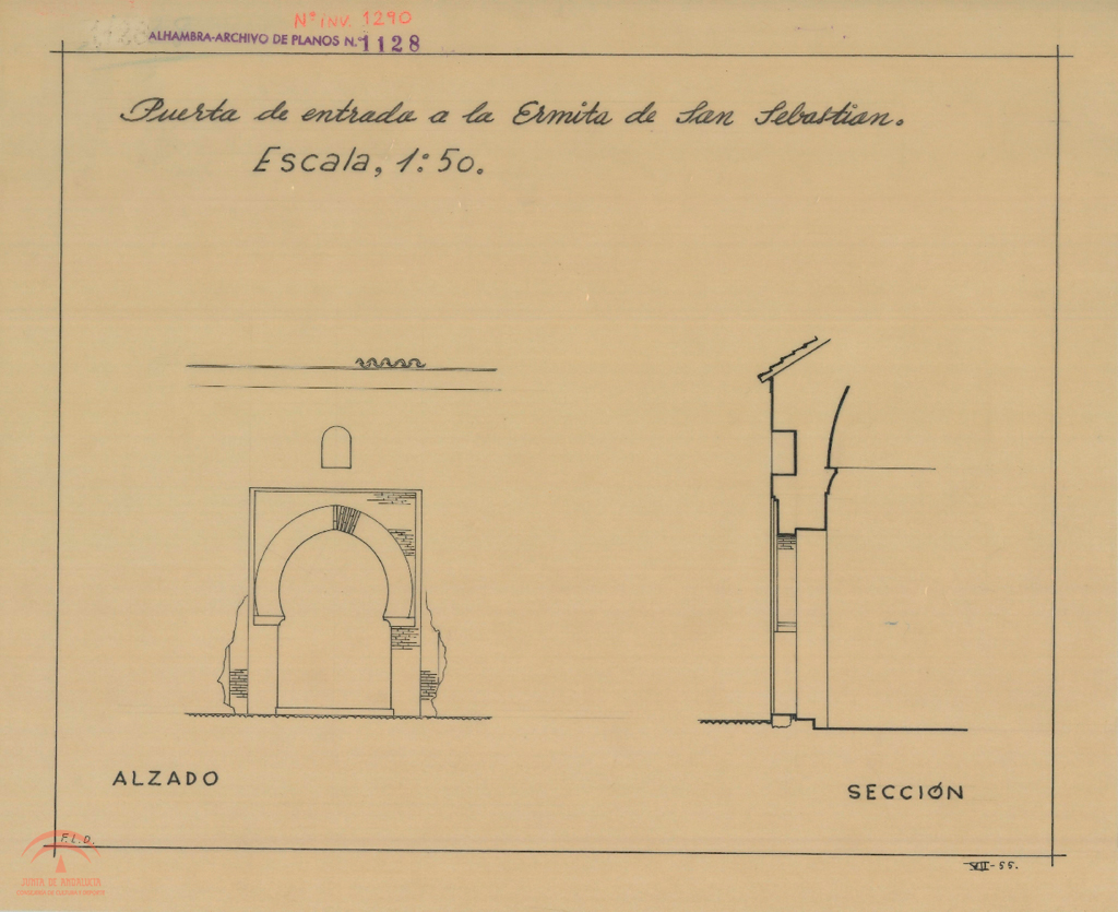Granada. Ermita de San Sebastián. Puerta de entrada. Alzado y sección