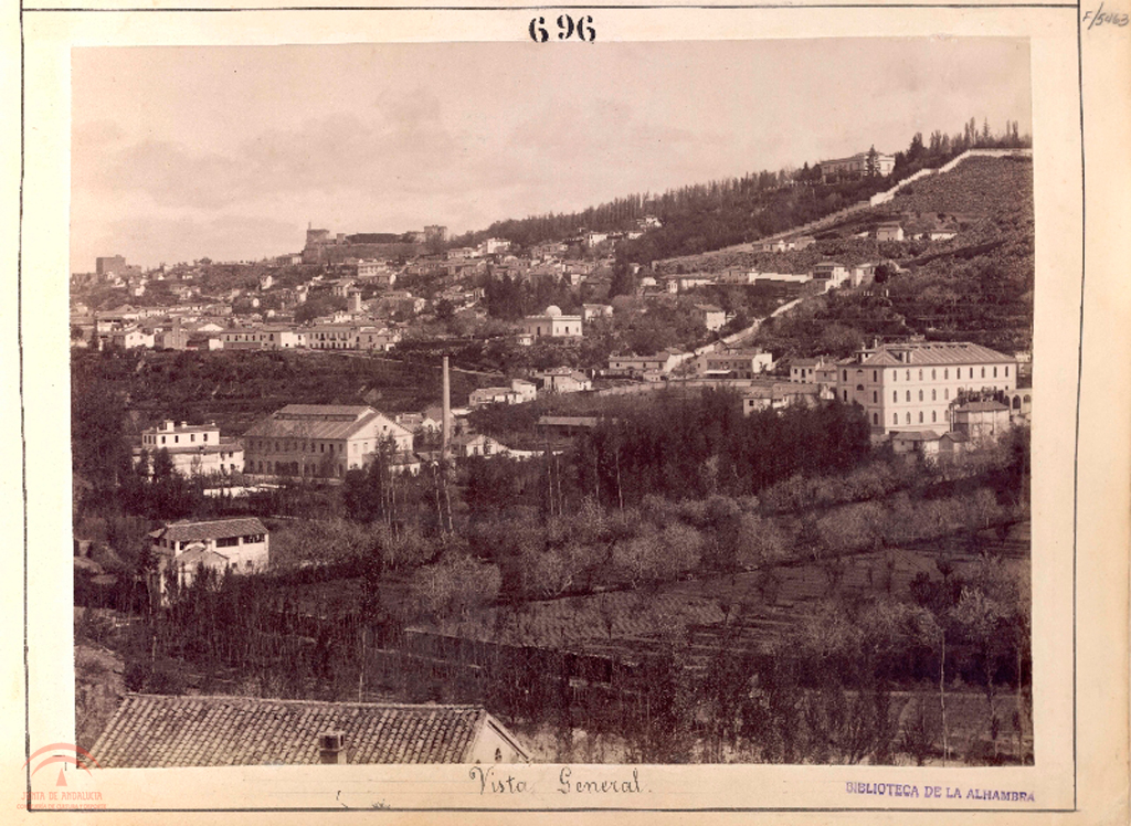 Descripción: pegada sobre soporte secundario, sello de la biblioteca, en la parte superior escrito "696"490x350 mm, copia a la albumina virada en sepia1.1.1. Compuesta por dos fotografias en la misma cara del soporte, esta acompañada por la F-05462 1.1.2. Titulo manuscrito en el soporte 1.4.4. En el sello se lee "Biblioteca de la Alhambra"