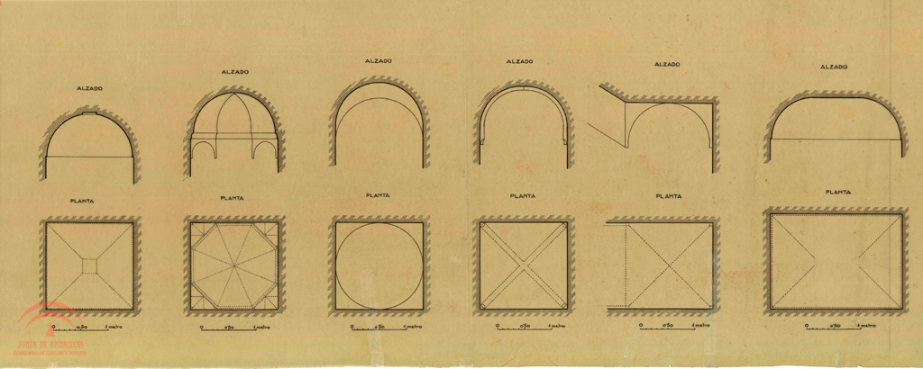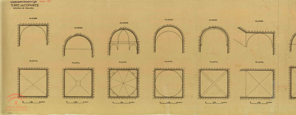 Resumen: Torre de Comares. Bóvedas de escalera. Alzados y plantas