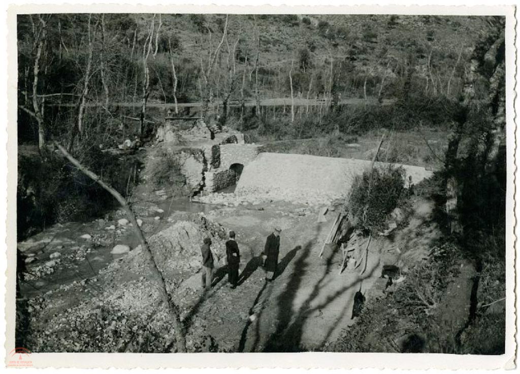Resumen: Imagen del reparto de 1952 de las Acequias del Rey y del Tercio, varias figuras humanas, al fondo una presa. Es la zona del cortijo de Jesus del Valle
