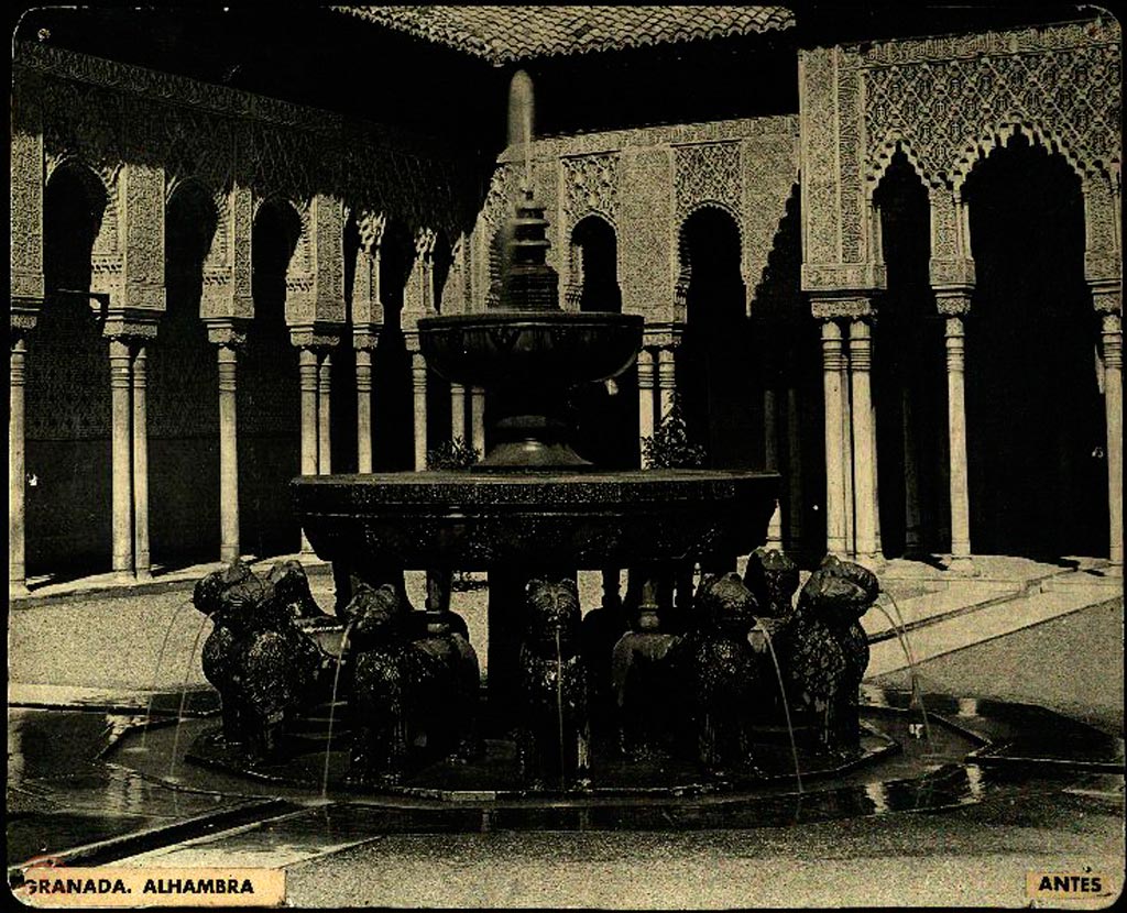 Resumen: Vista de la fuente de los leones con el añadido del "restaurador adornista" Rafael Contreras. en el Patio de los Leones