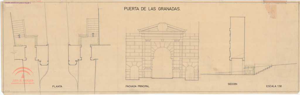 | Título: | Puerta de las Granadas. Planta, alzado de la fachada principal y sección. Proyecto de paso lateral |