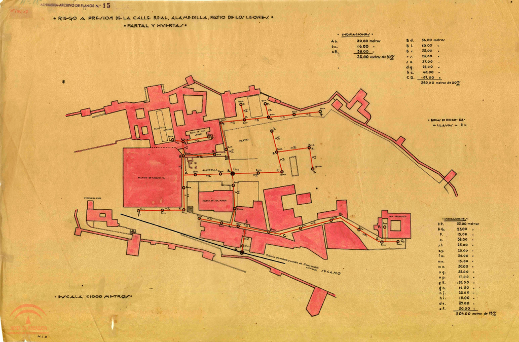 | Resumen: | Plano del riego a presión en los sectores de la Calle Real, Alamedilla, Patio de los Leones, Partal y Huertas |